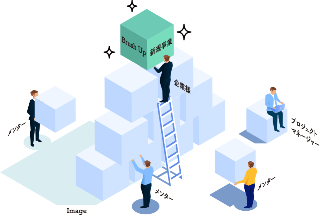 各企業様がお持ちの新規事業案を、社内において実証・開発フェーズの投資判断可能なレベルまで具体化、ブラッシュアップすることを目的とし、複数のメンターが、6ヵ月程度ハンズオンで支援します。