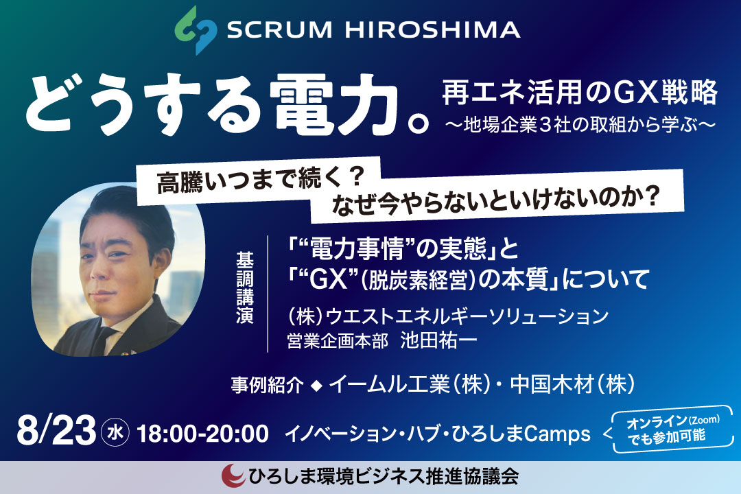 電力高騰の現状と将来見通しはどうなるのか。 カーボンニュートラル経営のエネルギー戦略とは。太陽光分野で長年、再生可能エネルギー開発に携わるウエストエネルギーソリューションの池田氏が、電力事情の実態とGX(脱炭素経営)の本質について講演。また地元で再エネ分野の発電に関わる3社の事例を通し、再エネやその市場について学びを深めてもらいます。協議会の会員以外の方の参加も広く募っています。 第5回「SCRUM HIROSHIMA」セミナー