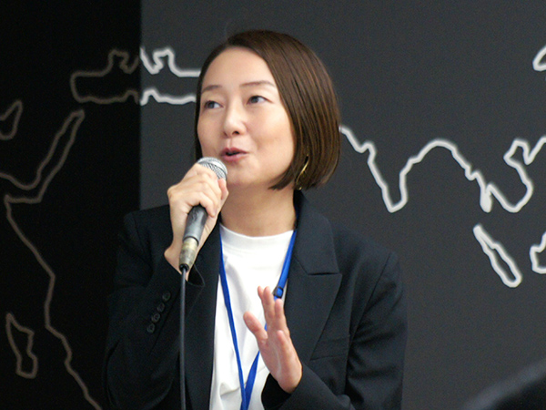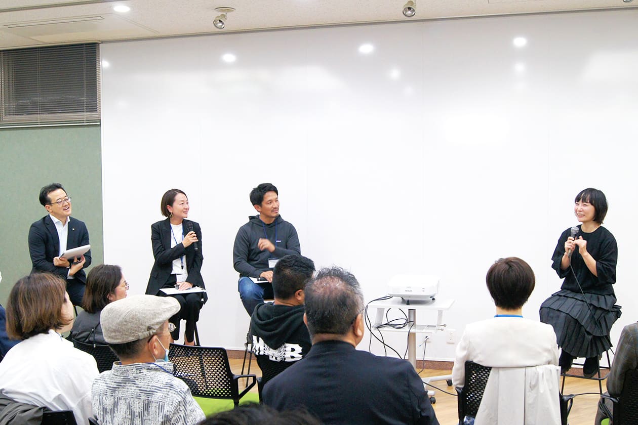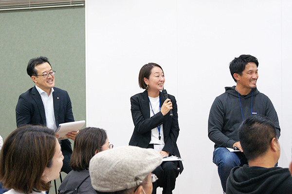 【トークセッション】 地元企業から、デニムメーカーの篠原テキスタイル株式会社の篠原由紀社長、カンボジア産生胡椒の塩漬けなどの販売を手掛けるAKO株式会社の速水亮子社長をゲストスピーカーに迎え、山口社長とトークセッションしていただきました。