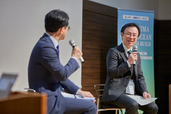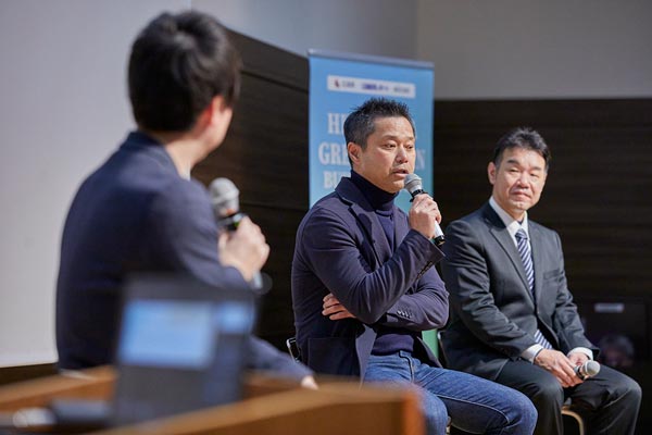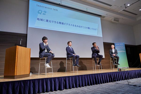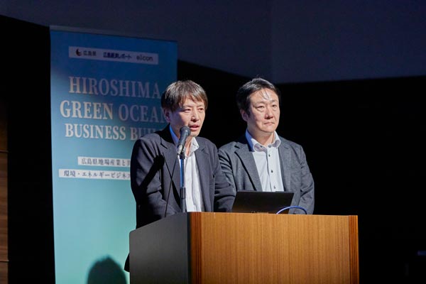 オープニングプログラムでは、SCRUM HIROSHIMAプレゼンツコンテンツとして、広島の自動車産業を牽引するマツダ株式会社の技術研究所・次世代環境技術研究部門 主幹研究員 市川 和男氏が登壇。冒頭で、2050年のサプライチェーン全体でのカーボンニュートラル達成に向けたマツダの研究内容や、地域連携で新たに参入しようとしているビジネスなど、環境・エネルギーに関連する取り組みの全体像についてプレゼンテーションがあった後、広島経済レポート 取締役編集次長の梶原 恭平氏がモデレーターとして加わり、研究開発において苦労したポイントや、大学および地域企業連携の際に意識していることなど、市川氏の実体験を交えながらお話しいただきました。