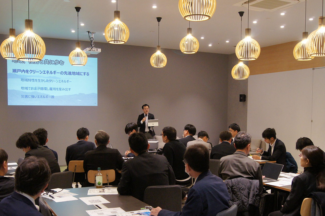 本年度オープンセミナー第2回を12月3日、コワーキングスペーストビオ(福山市西町)で開催しました。「瀬戸内海で叶える再生可能エネルギーの未来」と題した講演では、新たな再生可能エネルギー事業に挑む常石商事株式会社の津幡靖久副社長、独自の技術と知見を駆使して潮流発電の可能性を追求する